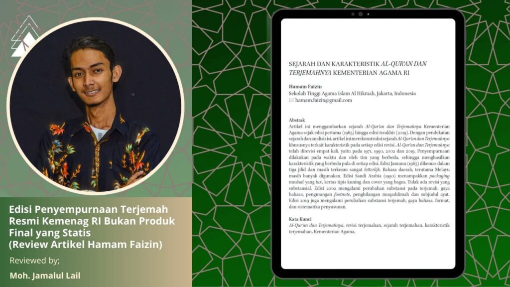 How to cite this Article: Moh. Jamalul Lail , Edisi Penyempurnaan Terjemah Resmi Kemenag RI Bukan Produk Final yang Statis (Review Artikel Hamam Faizin) , studitafsir.com (blog), 29 Januari 2023 (+ URL dan tanggal akses).
