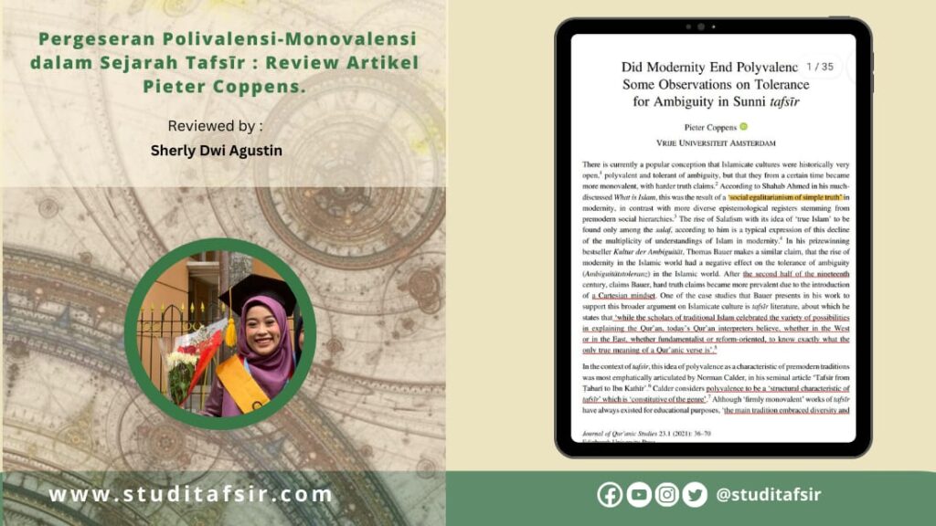How to cite this Article: Sherly Dwi Agustin, “Pergeseran Polivalensi-Monovalensi dalam Sejarah Tafsīr: Review Artikel Pieter Coppens.”, studitafsir.com (blog), Juni 24, 2023 (+ URL dan tanggal akses)